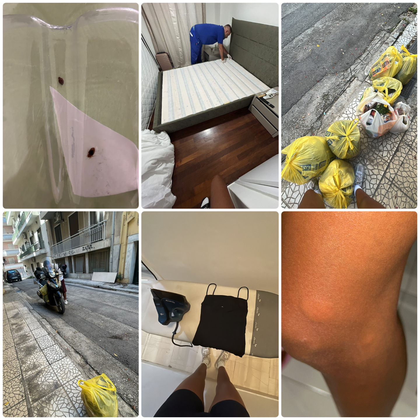 I added it to my collection of bugs. Then the exterminator arrived. He flipped everything over, dismantled all the furniture, and only to tell me there were no signs of bed bugs. I showed him my collection, and he said it must be an early stage of infestation, meaning I needed to vacate the property immediately. I had a job booked the next day with early call times. STRESS. Thankfully, the Airbnb owner let me stay at one of his other properties. My mum was also landing that night and was meant to stay with me. I was told to pack everything straight away and put all my clothes into bin bags for washing. Then I was told to wait downstairs for a worker to help me move my stuff, because I was not about to go for round 2. So there I am, standing on the road with 20 bin bags.